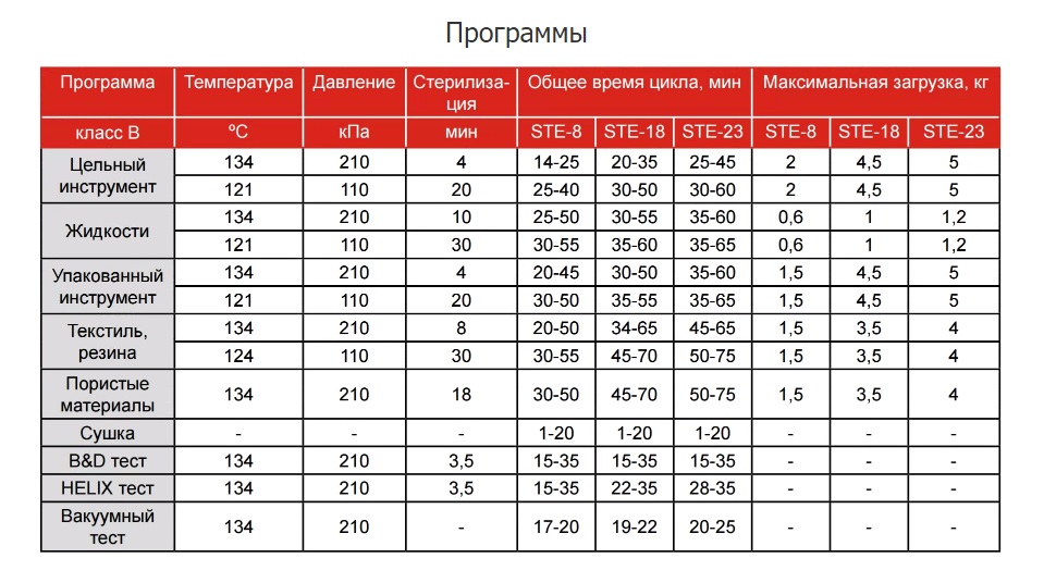 Автоклав STE-8 class B с предварительной вакуумизацией и вакуумной сушкой своего рода считается универсальным и имеет расширенные технические возможности, поэтому подходит для стерилизации всего спектра современных инструментов, принадлежностей и материалов: цельные, упакованные, полые упакованные типа A и B, пористые, жидкости.