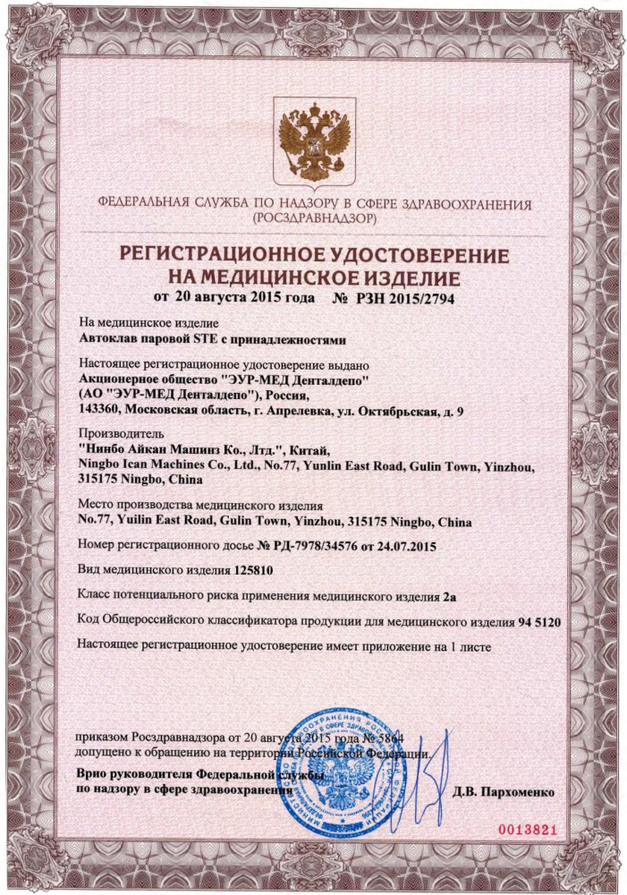 Автоклав IcanСlave STE-8 имеет Регистрационное Удостоверение, выданное Федеральной Службой по Надзору в Сфере Здравоохранения и Социального Развития.