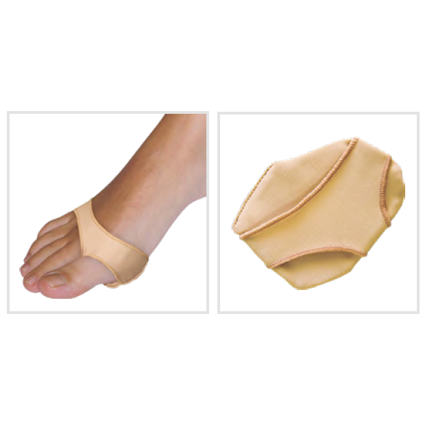 1.Наденьте эластичный бандаж на стопу, следя за тем, чтобы силиконовая подушечка располагалась в области головок плюсневых костей. Просуньте большой палец ноги в малое отверстие бандажа.