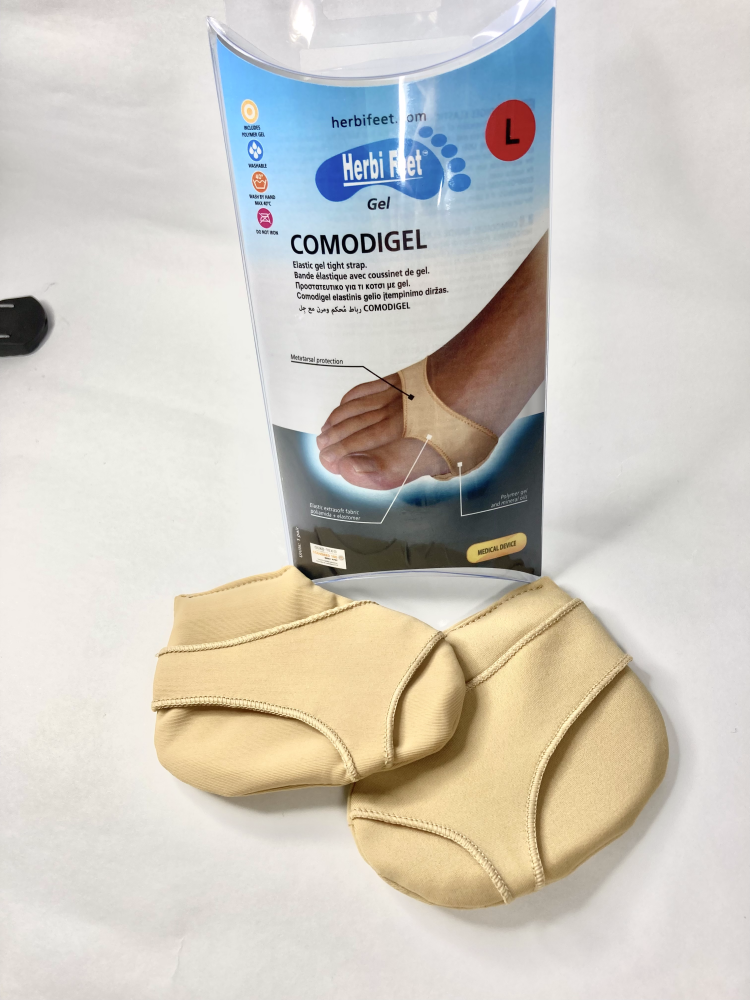 Эластичный бандаж Herbi Feet с силиконовой вставкой COMODIGEL способствует снижению нагрузки на передний отдел стопы и уменьшению болевых ощущений при ходьбе.