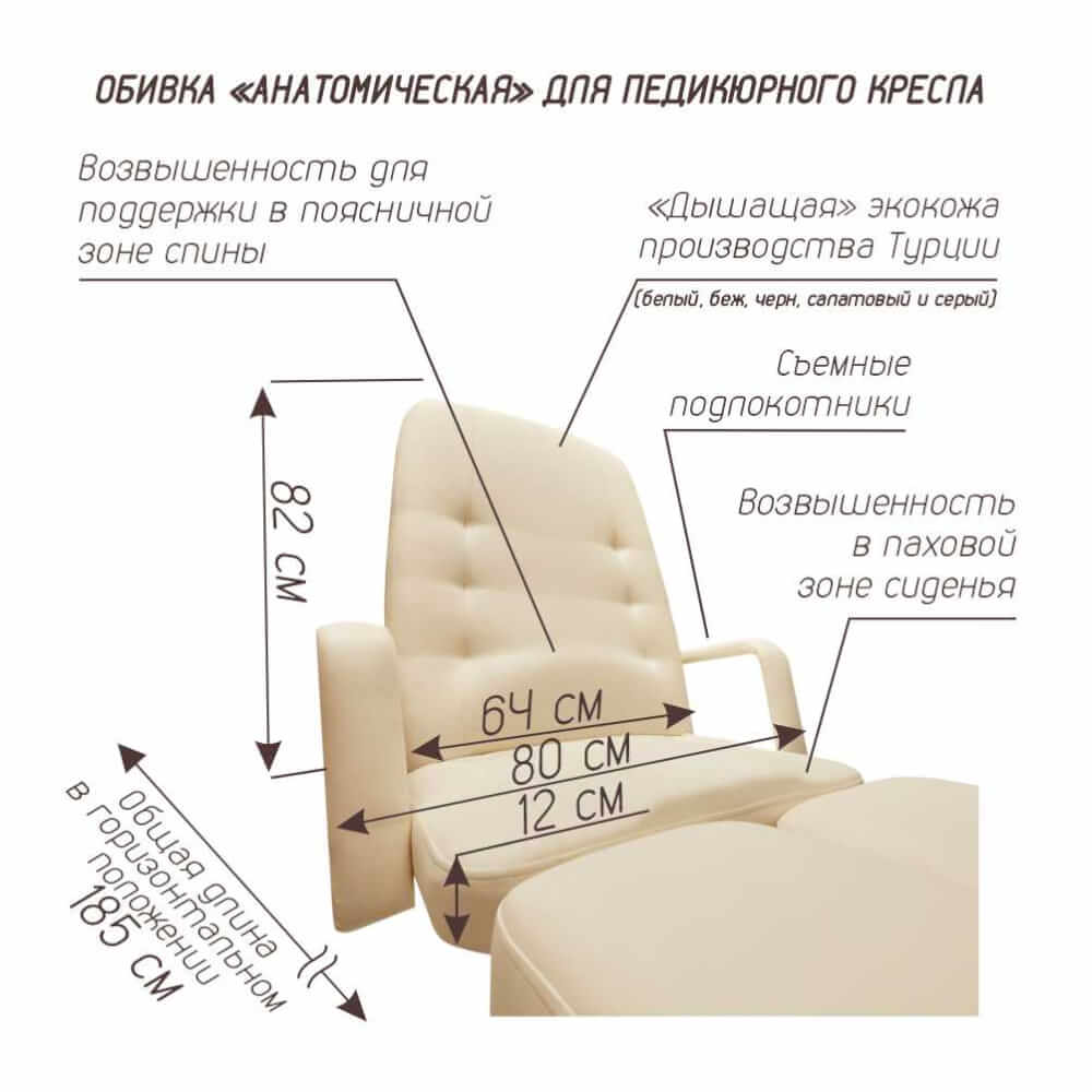 Возвышение (горбик) в паховой зоне, в сидячем положении, позволяет человеку «не скатываться» вперед, а в поясничной части, осуществляет поддержку поясничной зоны мышц спины, что позволяет их расслабить, что особенно удобно в горизонтальной раскладке. Все вышеперечисленные особенности, позволяют находиться человеку в комфортном состоянии более длительное время. Ножная часть оснащена механизмом удлинения (на 15 см) с механизмом фиксации в виде стопорного винта. Покрытие обивки матовая, не скользящая, высококачественная, износостойкая, «дышащая» экокожа производство Турции (50000 циклов, 100% PU полиуретан). Ширина ложа 64 см, длина 185 см. Съемные подлокотники.