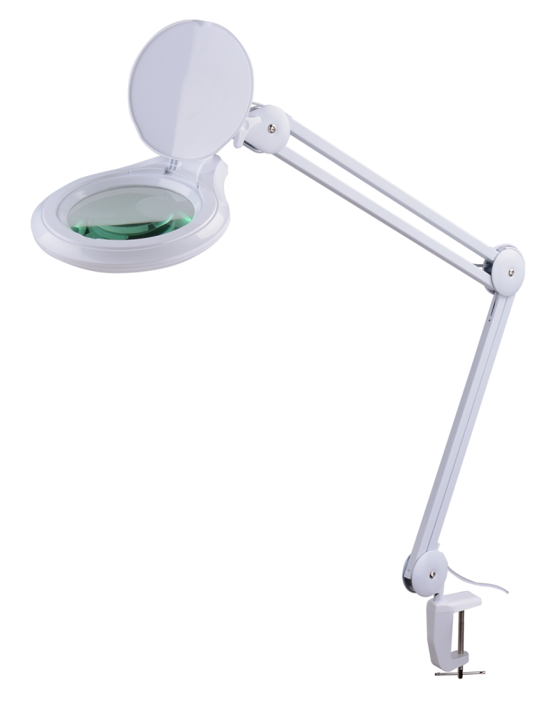 В лампе используется лупа в 8 диоптрий (увеличение примерно в 3 раза, фокусное расстояние 7 см). Лампа - дневного освещения, обеспечивает хорошую освещенность рабочей поверхности. Лампа излучает мягкий дневной свет, что помогает снизить напряжение глаз во время работы. Изготовлена из прочной пластмассы ABS белого цвета, устойчивой к воздействию дез. средств. Имеет штатив, позволяющий опускать и поднимать лампу на необходимую для работы высоту, и струбцину, позволяющую крепить ее к рабочей поверхности.