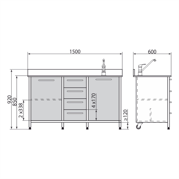 Стол-тумба с мойкой 1500*600*850 мм, 3 секции, PR-3-011-14