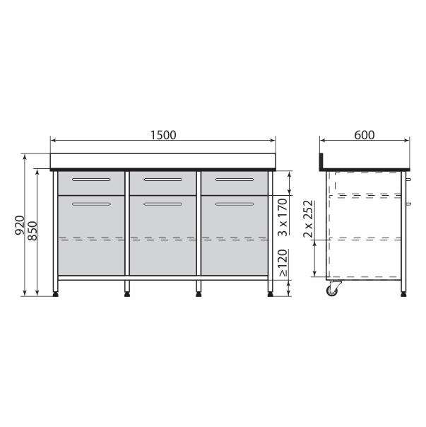 Стол-тумба 1500*600*850 мм, 3 секции с вехними ящиками, PR-3-009-08