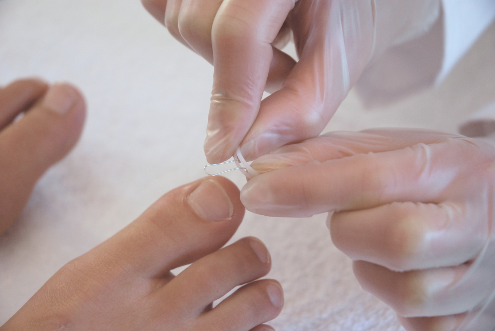 После установки пластины Подофикс петля прижимается к ногтю и сглаживается с помощью специального геля. Гель полимеризуется под воздействием ультрафиолетовой лампы.