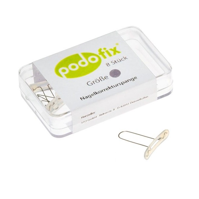 Системой предусмотрено 3 размера устройства Подофикс (S, M, L), которые подбираются в зависимости от ширины ногтевой пластины. PodoFix менее капризна при установке, чем другие подобные устройства, установка абсолютно не вызывает неприятных ощущений. Время ношения коррекционной системы индивидуально для каждого пациента (от 2 недель до 2-3 месяцев).